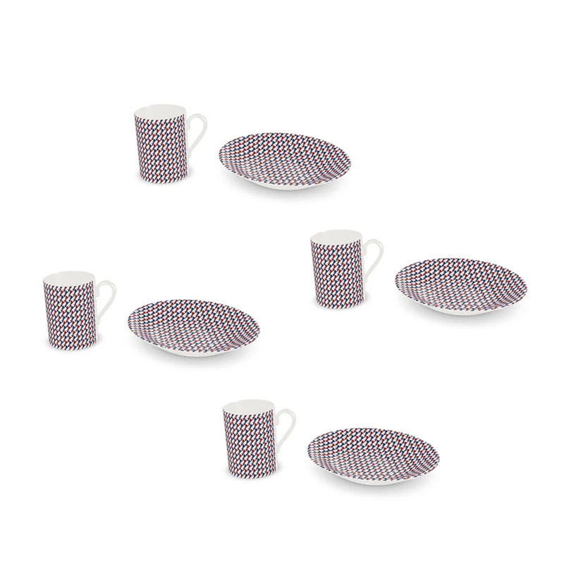 赤、白、青のスキーブーツ模様のシャレー用エスプレッソカップとソーサー